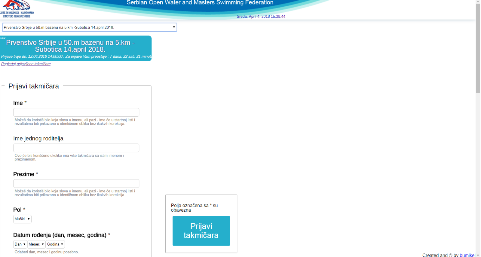Popunite ponuđeni obrazac Prijave i kliknete na plavo polje Prijavi takmičara. Dobićete poruku na vašem mailu koji ste naveli.Treba da ga otvorite i potvrdite prijavu.Napominjemo da ako vam se dobijeni mail ne nalazi u glavnoj pošti onda je sigurno prebačen u SPAM-u odnosno nepoželnu poštu , koju treba da otvorite i potvrdite prijavo.