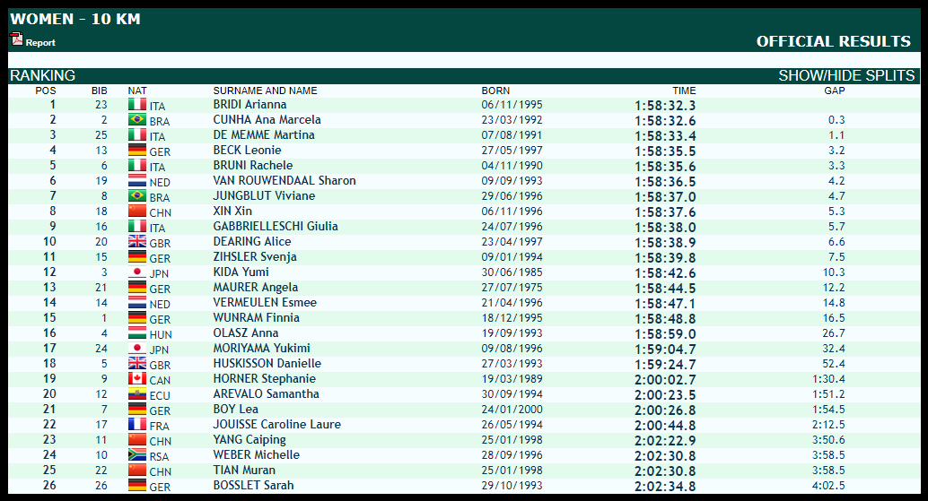U ženskoj konkurenciji pobednica je bila BRIDI Arianna sa vremenom od 1:58:32,3 samo 3.desetinke ispred brazilke CUNHA Ana Marcela, a trećeplasirana je bila takodje takmičarke iz Italije DE MEMME Martina sa zaostatkom od 1,1 sekundi