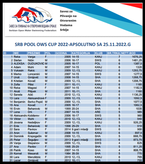 Ažurirani su rezultati SRB POOL OWS CUPa sa 25.11.2022.godine.