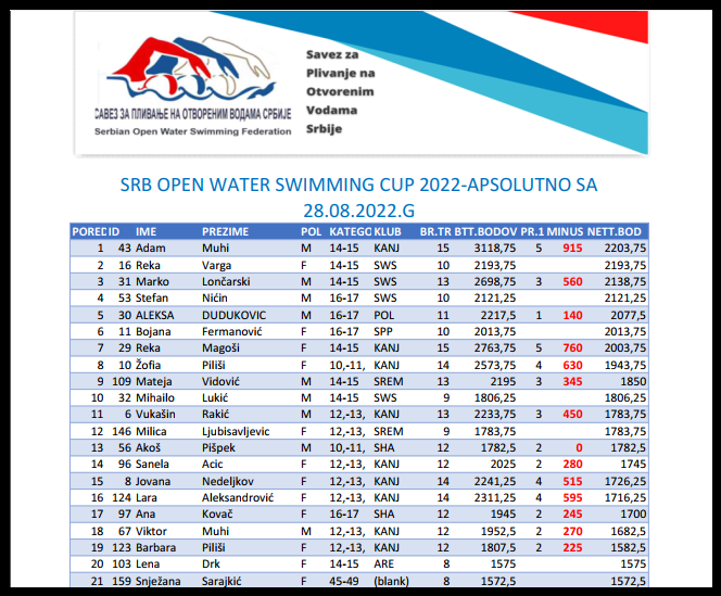 Ažurirani su trenutni rezultati dva kola pre završetka 16.Kupa Srbije u plivanju na otvorenim vodama-SRB OPEN WATER CUP.Prva mesta u apsolutnoj muškoj i ženskoj konkurenciji su zaslužno obezbedili Adam Muhi 2007.g iz PK Kanjiža i Reka Varga 2007.g PK Swim star Bečej.