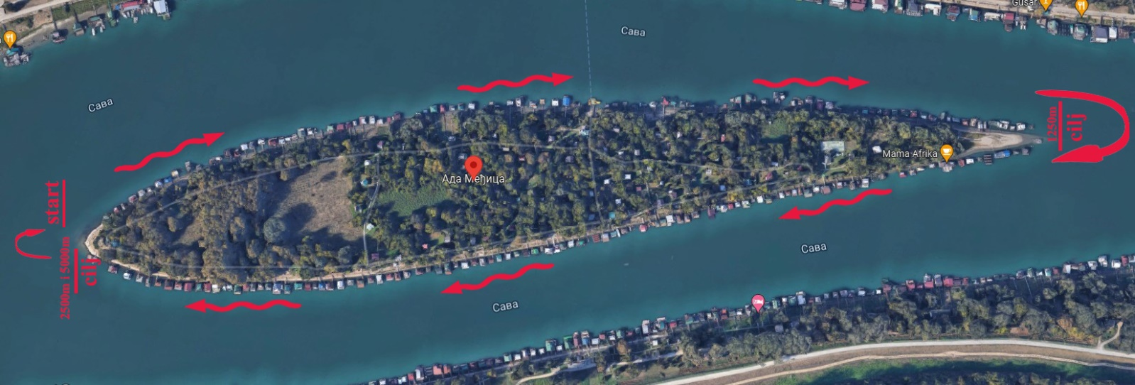 *1250 metara (nizvodno,jedna dužina ostrva),