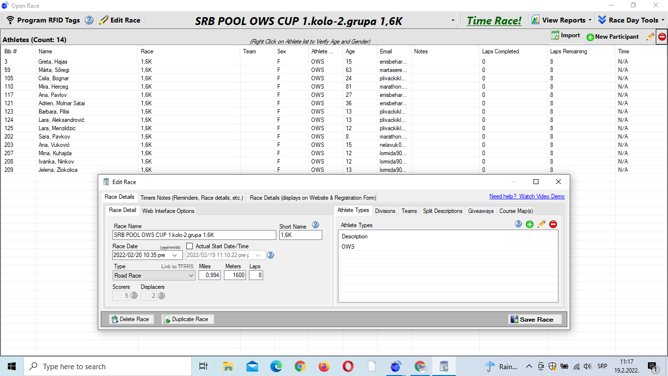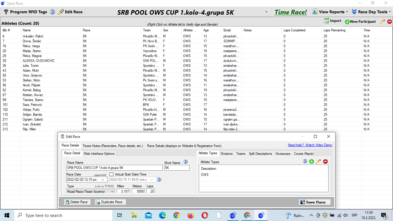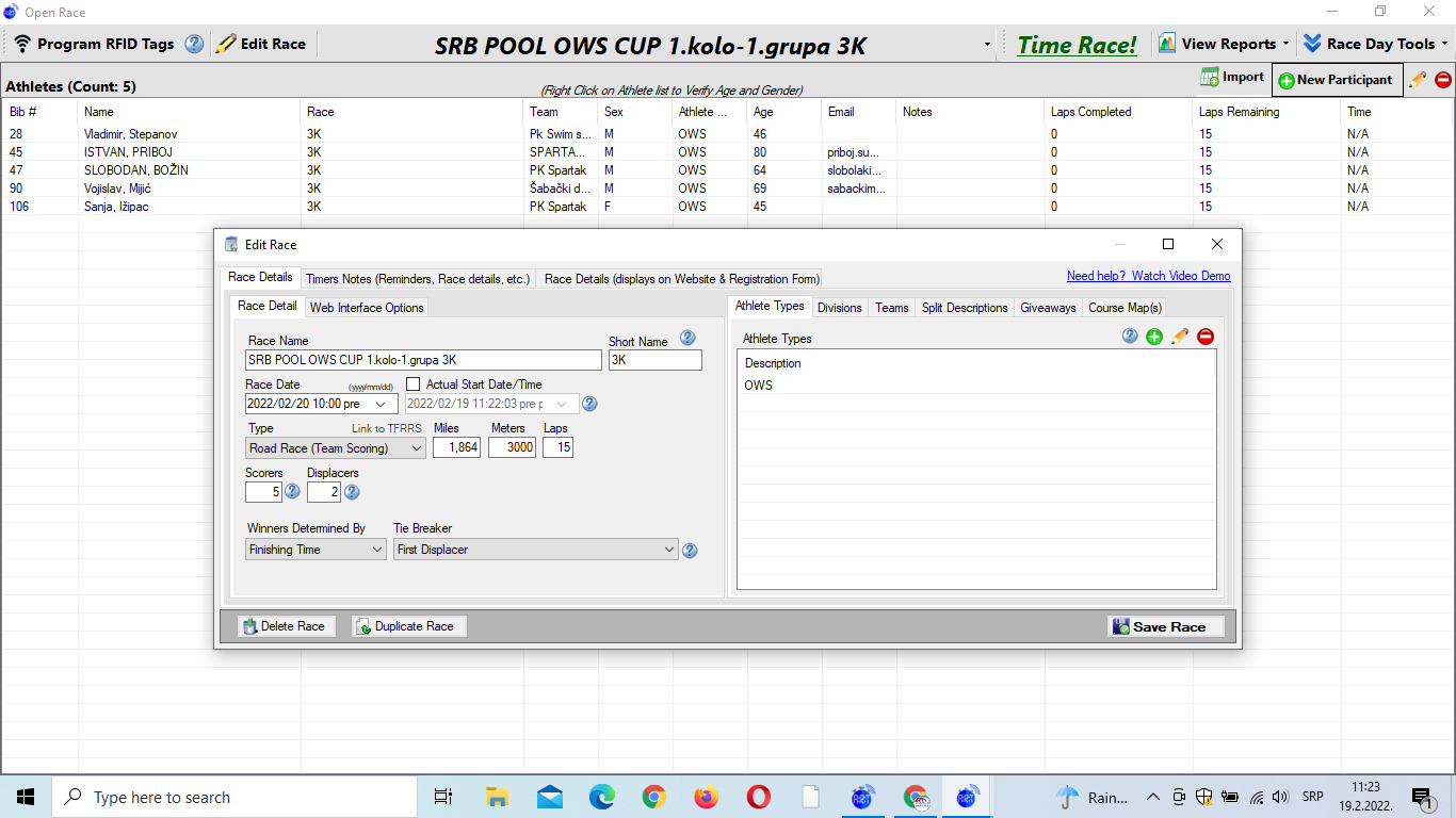 19.februar 2022.-Startne liste SRB POOL OWS CUP-a 1.kolo