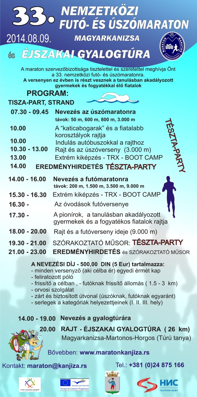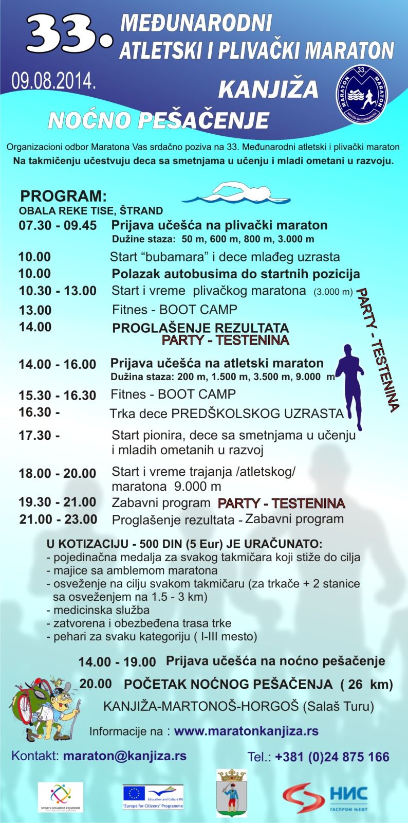 Dana 09.08.2014.godine(SUBOTA) održava se 33.Medjunarodni atletski i plivački maraton u Kanjiži.Plivačka disciplina na 3.km se boduje u odviru #10.-SRB-OPEN KUPA 2014.godine.U prilogu su propozicije i programi takmičenja.