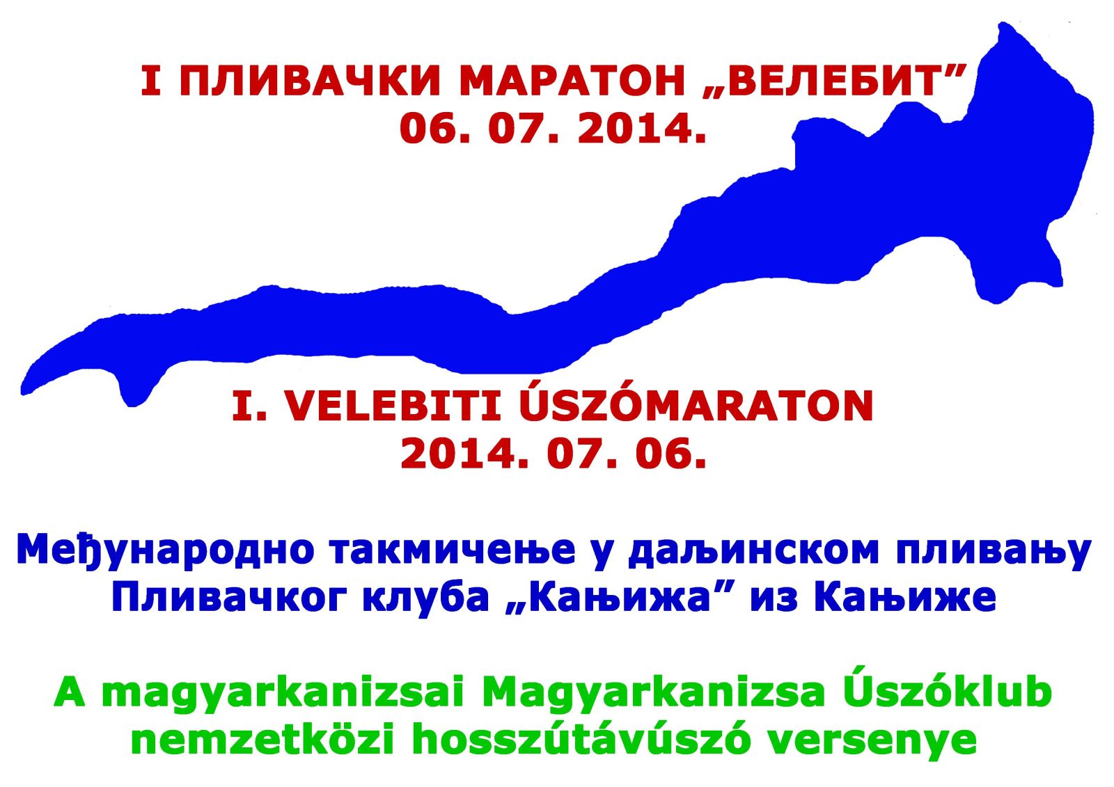 Dana 06.07.2014.godine u mestu Velebit opština Kanjiža a na jezeru Velebit se održava 1.Medjunarodni plivački maraton u dužini od 3.000 metara.U prilogu su propozicije takmičenja kao i plakat.Na plakatu su GPS kordinate i plan mesta radi lakšeg snalaženja.