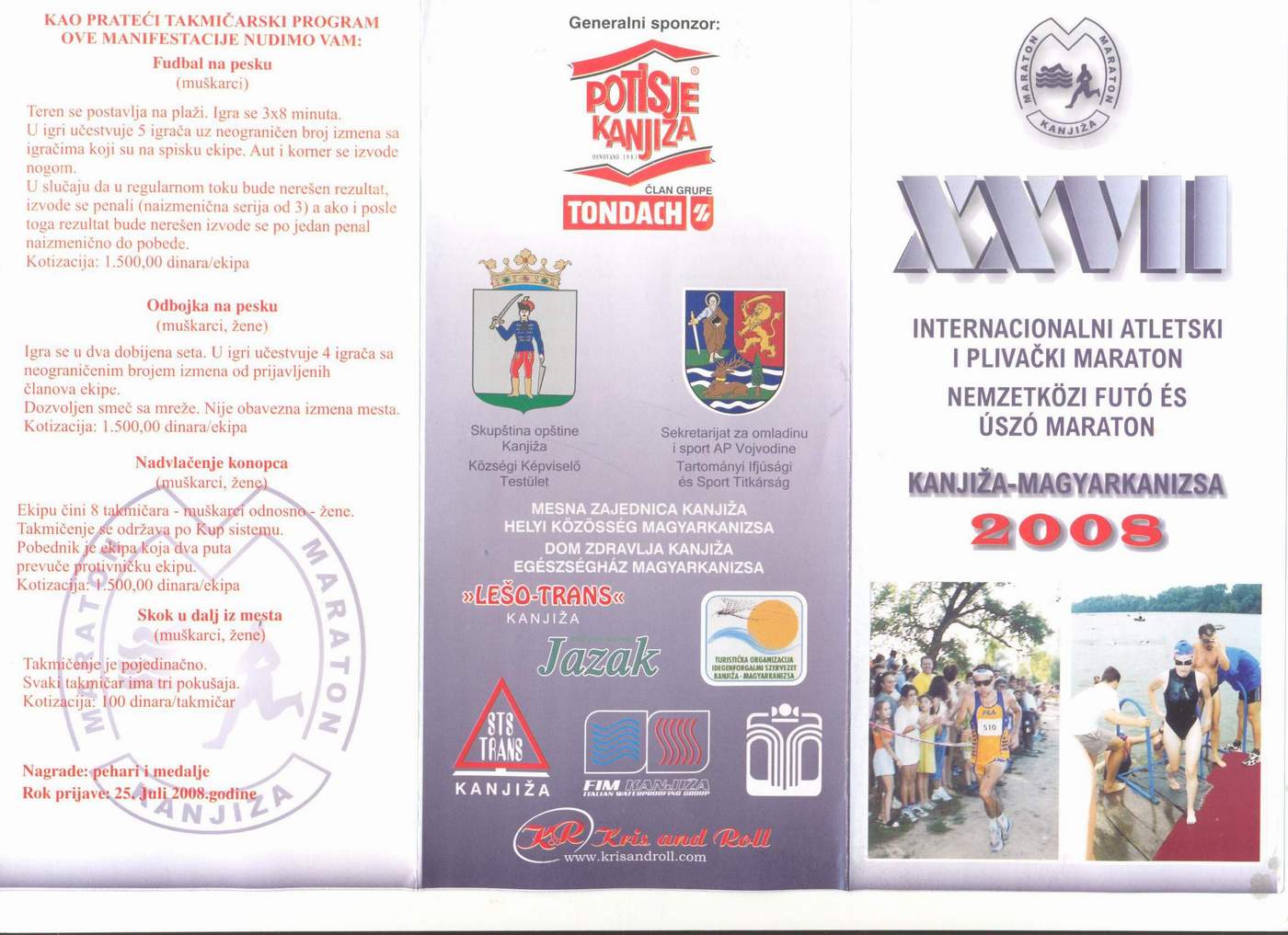 05.08.2008.U Kanjiži se 10.08.2008.god. održava tradicionalni 27.Internacionalni atletski i plivački maraton.Takmičenje se boduje za Vojvodjanski kup.