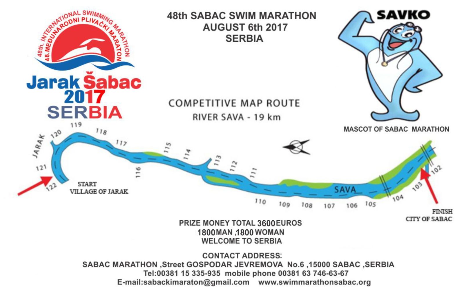 Maraton će biti održan u nedelju 06. avgusta 2017.godine u dužini od 19.km na reci Savi kod Šapca sa startom u 11. časova i pliva se od sela Jarak do Šapca.