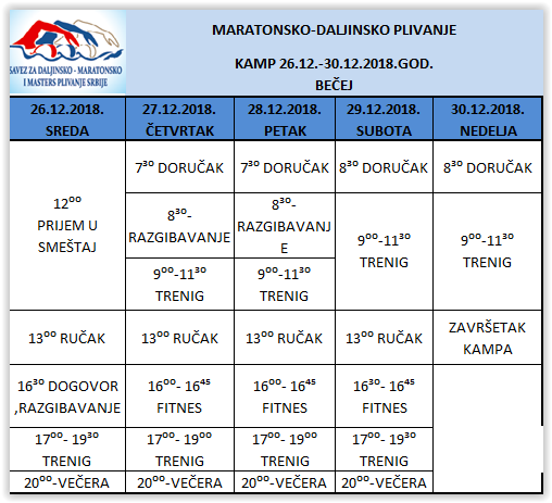 U skladu sa planom razvoja plivanja na otvorenim vodama i odluke Skupštine Saveza od 15.septembra 2018.god. u Novom Gradištu na Srebrnom jezeru,Stručni savet Saveza DMMPS će u narednom periodu organizovati više pripremnih kampova.Prvi kamp se održava 26.12.-30.12.2018.godine u Bečeju a satnica je sledeća: