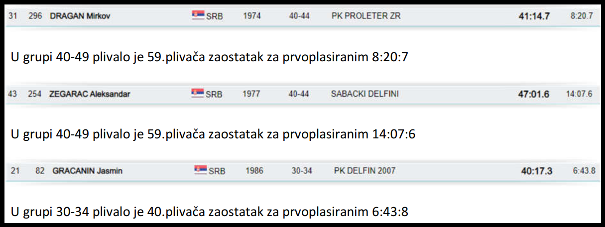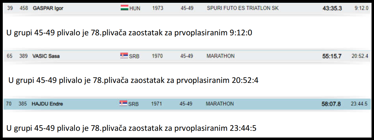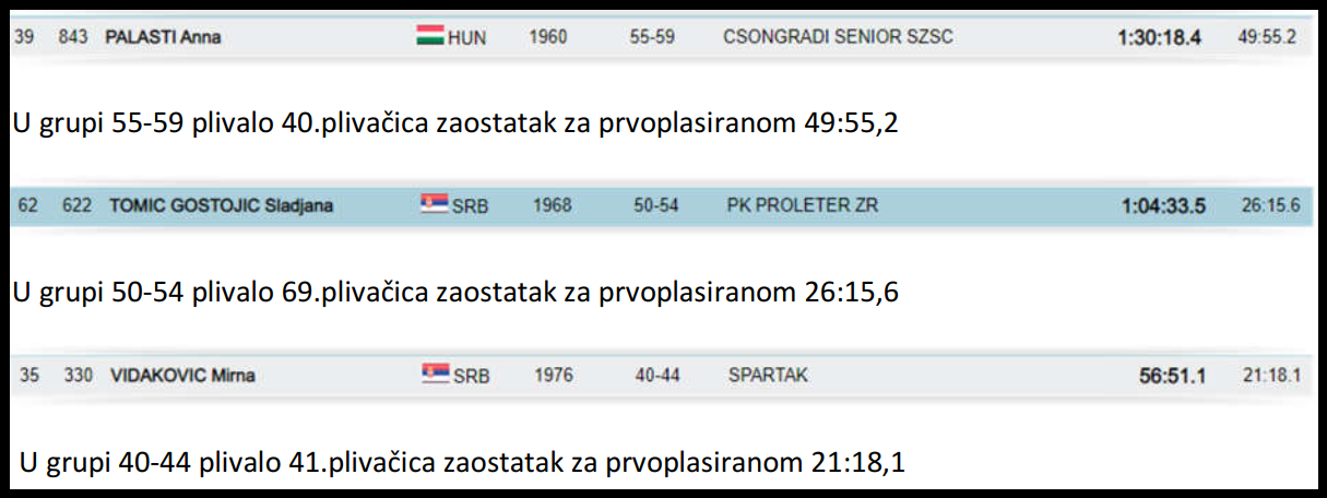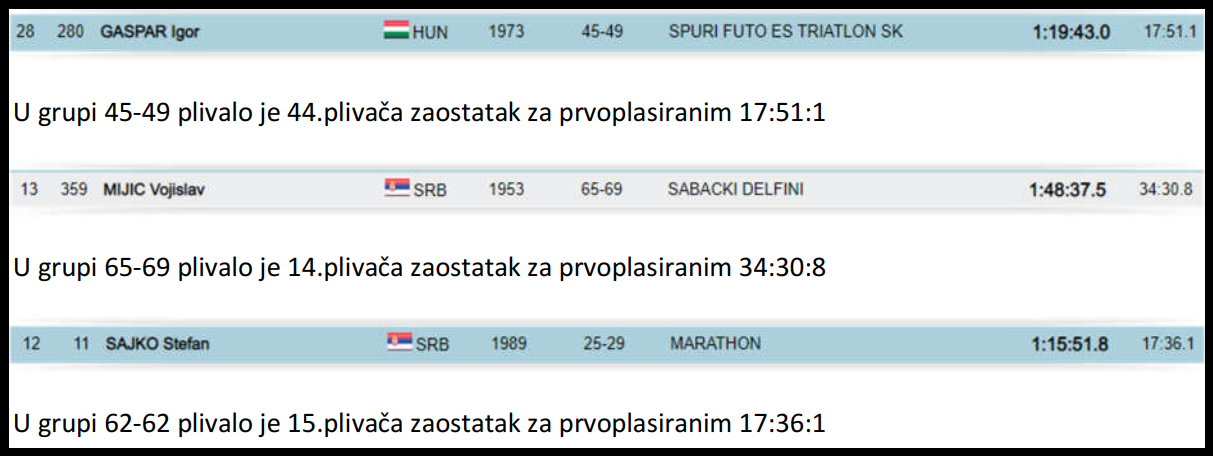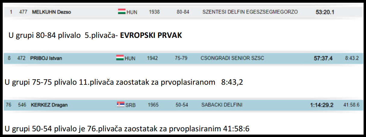 Juče 08.09.2018.godine u Bledu trkom na 3.km počelo je Evropsko masters prvenstvo u plivanju na otvorenim vodama, a danas se završilo trkom na 5.km.Na prvenstvu je učestovalo iz Srbije 11.plivača plus tri licencirana takmičara SRB OPEN WATER CUP-a u Madjarskim klubovima.Od tih 14. jedini koji je plivao 3.km i 5.km je bio Igor Gašpar.U nastavku dajemo pojedinačan pregled plasmana i rezultata sa ukupnim brojem plivača u starosnoj kategoriji kao i zaostatka za prvoplasiranim ,