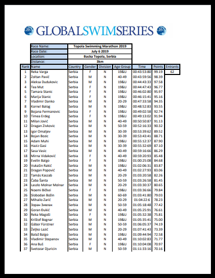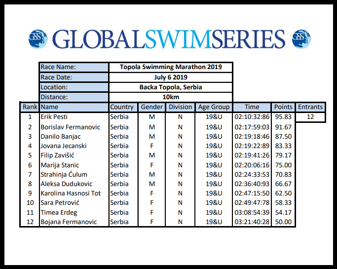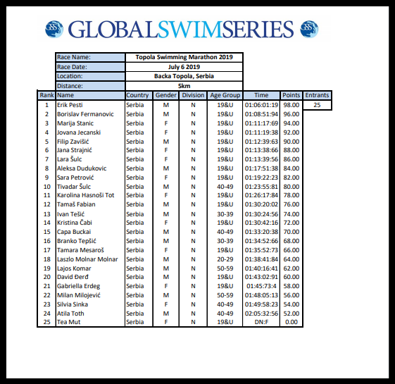 16.juli 2019.-Izašli su rezultati iz BačkeTopole na rang listi u Global Swim Series