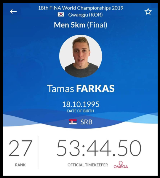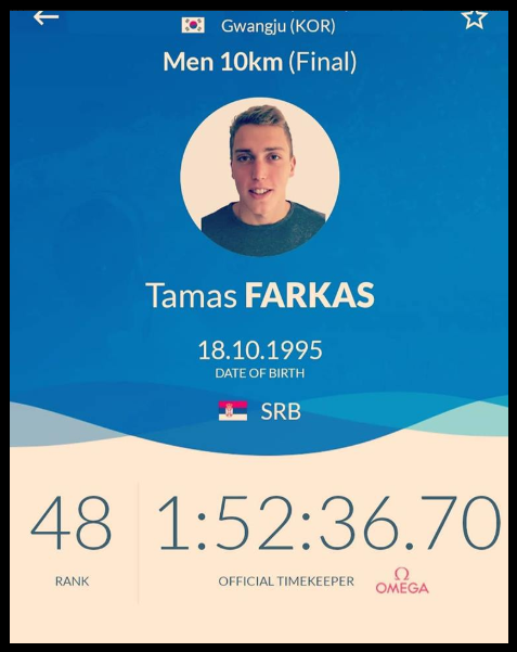Tamaš Farkaš naš predstavnik na Svetskom prvenstvu u plivanju na otvorenim vodama u Koreji danas je trkom na 10.km završio učešće.On je postigao do sada najbolje rezultate u karijeri na ovom prestižnom takmičenju.Svojim nastupom i rezultatima pokazao je da poseduje kvalitet svetskih razmera u plivanju na otvorenim vodama.U trci na 5.km njegov zaostatak u vremenu od prvoplasiranog je bio 22 sekunde.U poredku od drugog do 27.mesta zaostatak je bio svega 12.sekundi, što znači da je u cilj za to vreme ušlo 26.plivača.