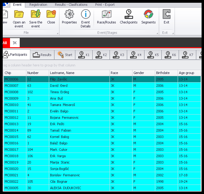 Svim takmičarima se automatski dodeljuje čip odnosno broj na osnovu koga program razlikuje učesnike.