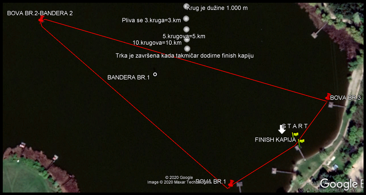 Plivačka staza sutrašnjeg takmičenja je u obliku trougla dužine 1.000 m, obilježena sa tri bove kao na slici.Na svakom okretištu će biti po jedan sudija.Ukupno će biti pet sudija.