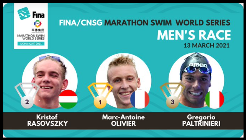 Marc-Antoine Olivier (FRA) i Ana Marcela Cunha (BRA) bili su pobednici prvog takmičenja FINA/CNSG Marathon Swim World Series 2021. Doha (QAT), koje je održano 13. marta 2021.god.U muškoj trci Marc-Antoine Olivir je sačuvao prošlogodišnju titulu, dok u ženskoj trci je finiš bio veoma uzbudljiv i neizvestan gde je Ana Marcela Cunha pobedila u foto finišu.