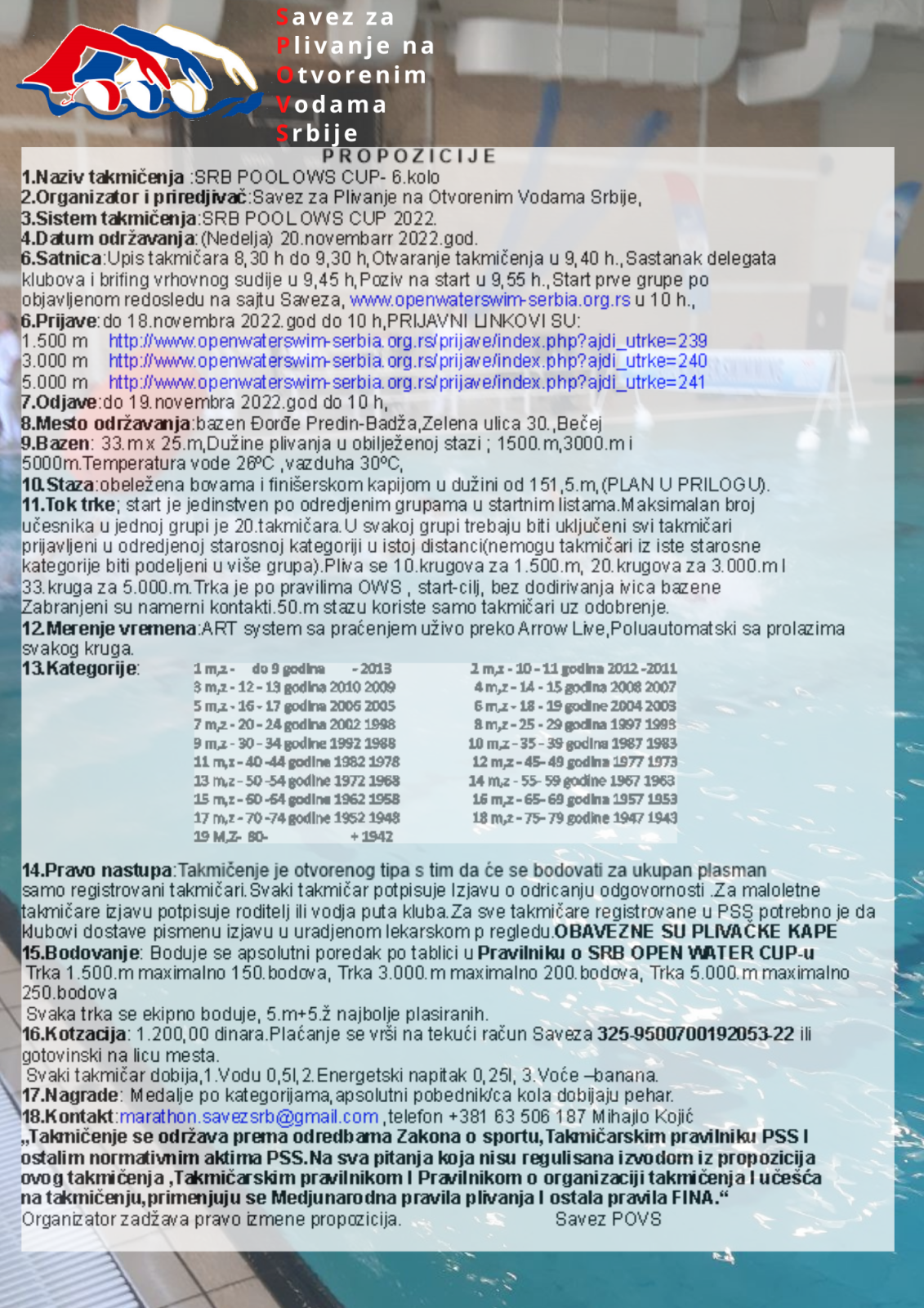 Ovim obaveštavamo sve zainteresovane da su otvorene prijave u nedelju 13.11.2022.godine za 6.kolo SRB POOL OWS CUP koje se održava u nedelju 20.11.2022.god u Bečeju po objavljenim propozicijama .