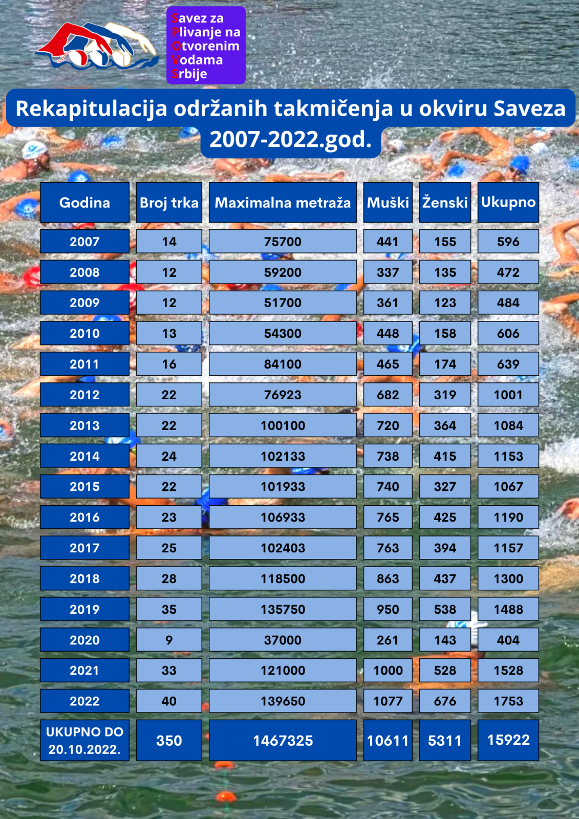 Očigledan je trend povećanja broja zainteresovanih takmičara.Bitno je istaći da i pored odredjenih poznatih obstrukcija smo izgradili sopstveni sistem prijava i ažuriranja baze podataka sa ažuriranim licenciranim takmičarima u Srbiji sa interesom za "Plivanje na otvorenim vodama". Na osnovu uradjene sveobuhvatne analize, preduzet ćemo odgovarajuće mere za razvoj ovog akvatik sporta.Radit ćemo i analizu rada i rezultata naših vrhunskih takmičara koji su ponikli u ovom Savezu.