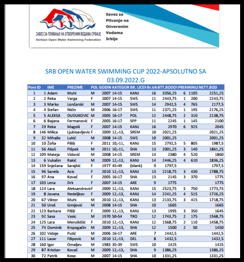 Ažurirani su trenutni rezultati dva kola pre završetka 16.Kupa Srbije u plivanju na otvorenim vodama-SRB OPEN WATER CUP.Prva mesta u apsolutnoj muškoj i ženskoj konkurenciji su zaslužno obezbedili Adam Muhi 2007.g iz PK Kanjiža i Reka Varga 2007.g PK Swim star Bečej.