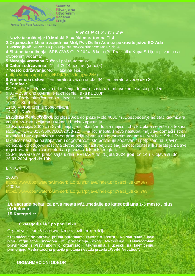 20.juli 2024.-Najava 19.Molskog plivačkog maratona na Tisi Ada-Mol 4000m za 27.07.2024.g
