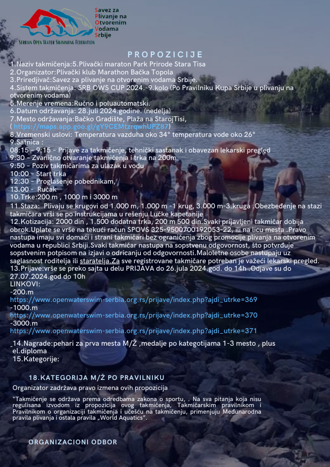 21.juli 2024.-Najava 5.Plivačkog maratona Park prirode Stara Tisa za 28.juli 2024.