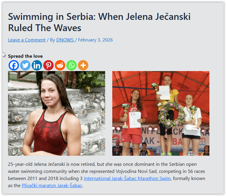 Daily News of Open Water Swimming (DNOWS) objavio je 3. februara 2026. tekst posvećen Jeleni Ječanski, jednoj od najvažnijih sportistkinja